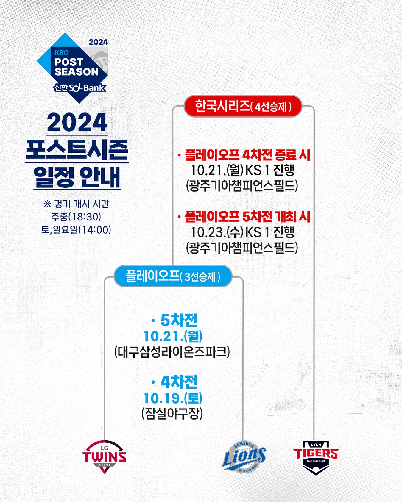 오늘 순연으로 이동일을 포함하여 플레이오프 모든 일정이 하루씩 순연됩니다. 단, 한국시리즈는 플레이오프 결과가 정해진 일정에 영향을 미치지 않을 경우 예정된 일정으로 개최합니다.
